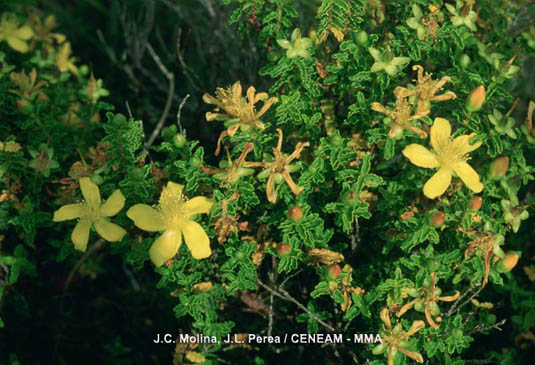 Estepa joana (Hypericum balearicum). Se cría en lugares secos y pedregosos de la maquía y encinares aclarados.