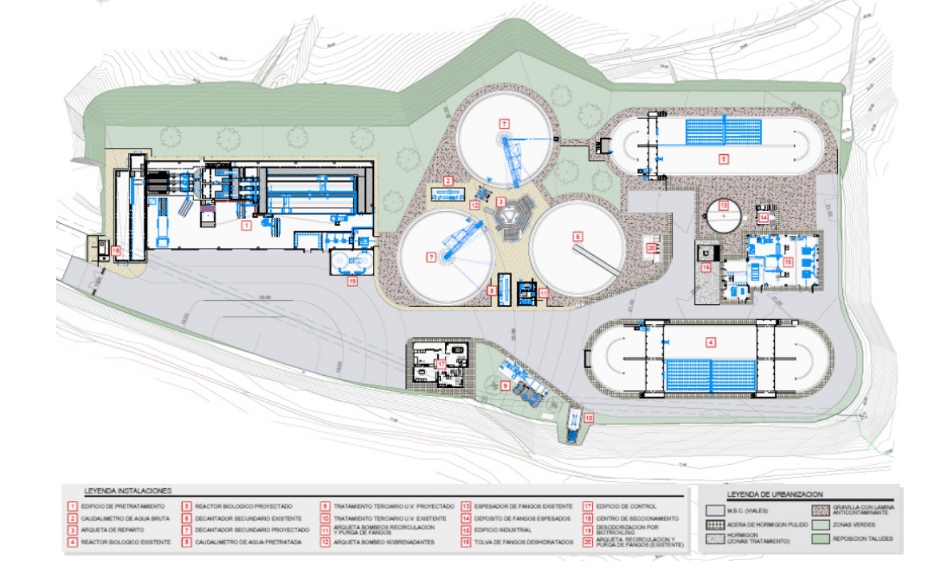 Para la implantación del nuevo proceso proyectado se ha tenido en cuenta la configuración actual de la EDAR existente de forma que las obras de ampliación y mejora reduzcan, por un lado, al mínimo las interferencias con el proceso de tratamiento actual y, por otro, aprovechen al máximo las instalaciones existentes.
