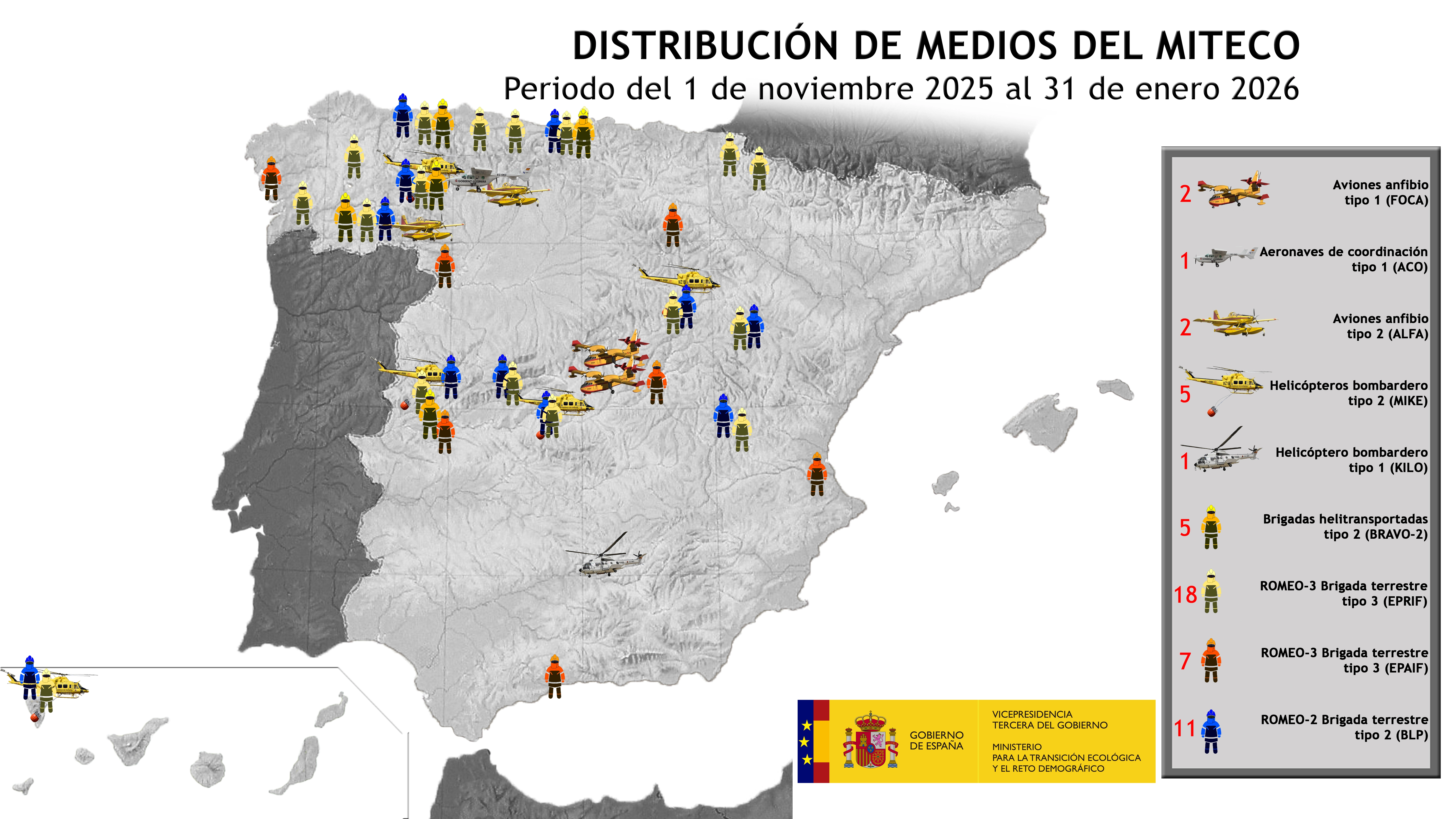 En ese sentido, el Ministerio para la Transición Ecológica y el Reto Demográfico (MITECO) despliega una serie de medios por toda España para asegurar esa función de apoyo a las comunidades autónomas en labores de extinción y prevención, teniendo en cuenta que dichos medios son de cobertura nacional, es decir, no están adscritos al lugar donde se ubican, sino que podrán actuar en cualquier punto del territorio donde sean necesarios.