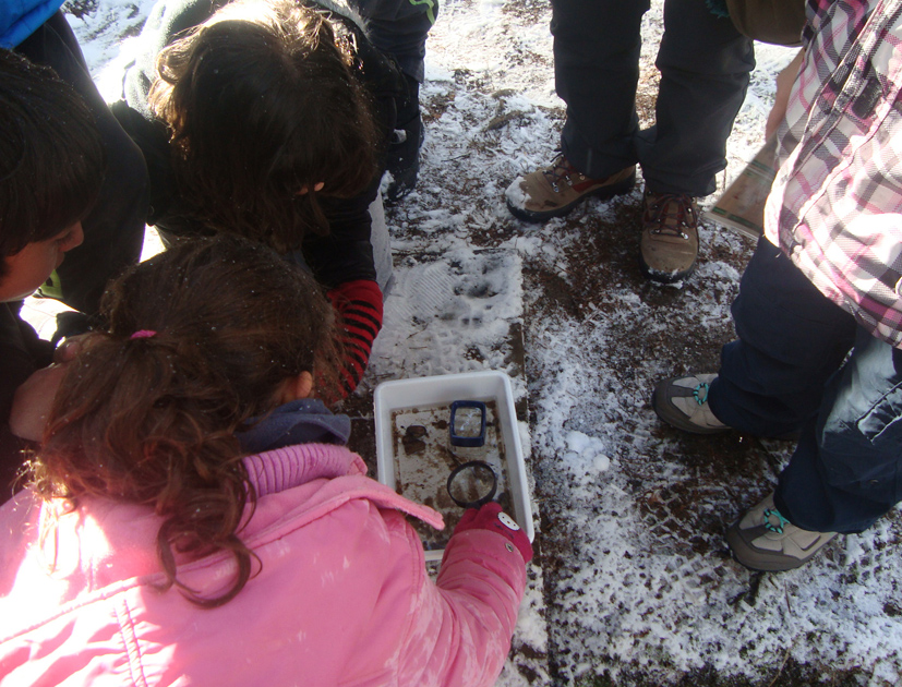 Los participantes en la actividad realizan observaciones en una muestra de agua recogida del arroyo