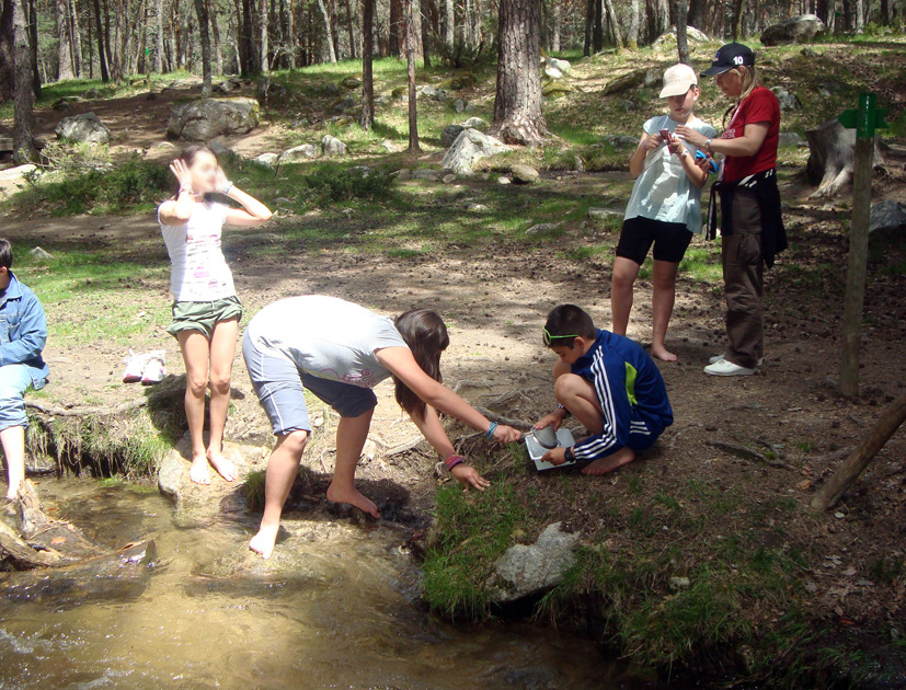 Un grupo de participantes extraen muestras del agua del arroyo para su obsevación