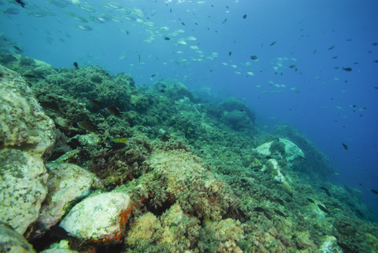 -9m. En las cuevas que forman los bloques de piedra, es posible ver, todavía, algunos meros, aunque muy asustadizos por la presión que la caza submarina ejerce sobre ellos.