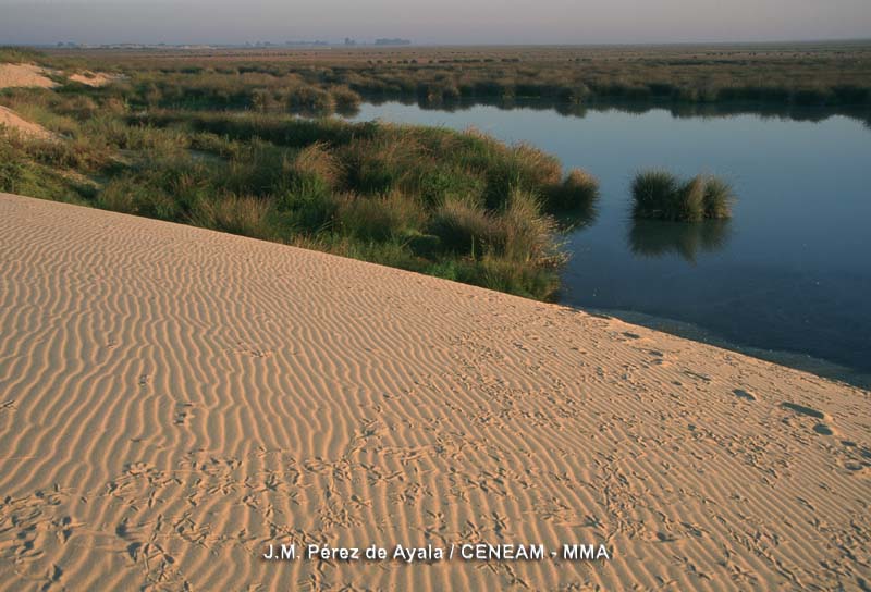 Las dunas móviles son arrastradas por el viento, hasta que en ocasiones llegan a la marisma donde se detienen.