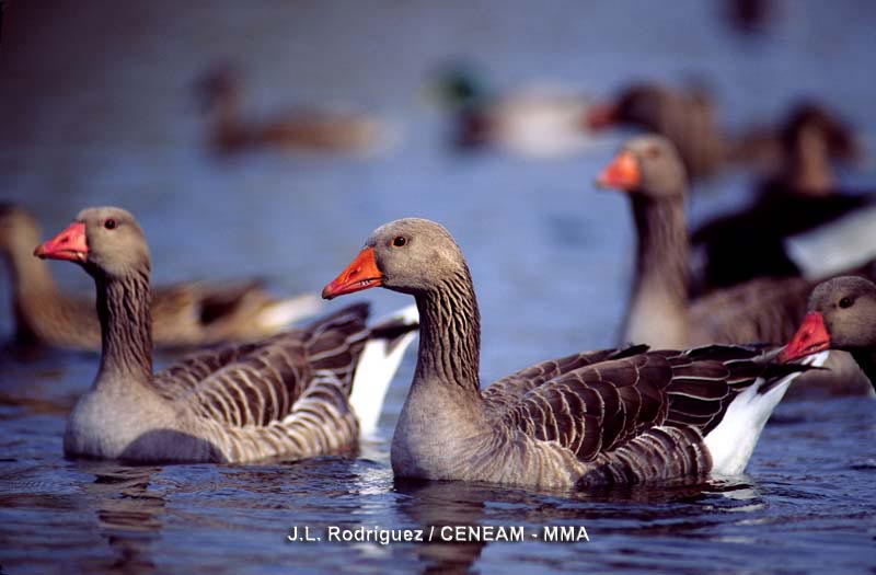 El ansar común (Anser anser) es una especie migradora que llega masivamente a España en octubre y se marcha en marzo. A Doñana algunos años llegan 80.000 ejemplares.
