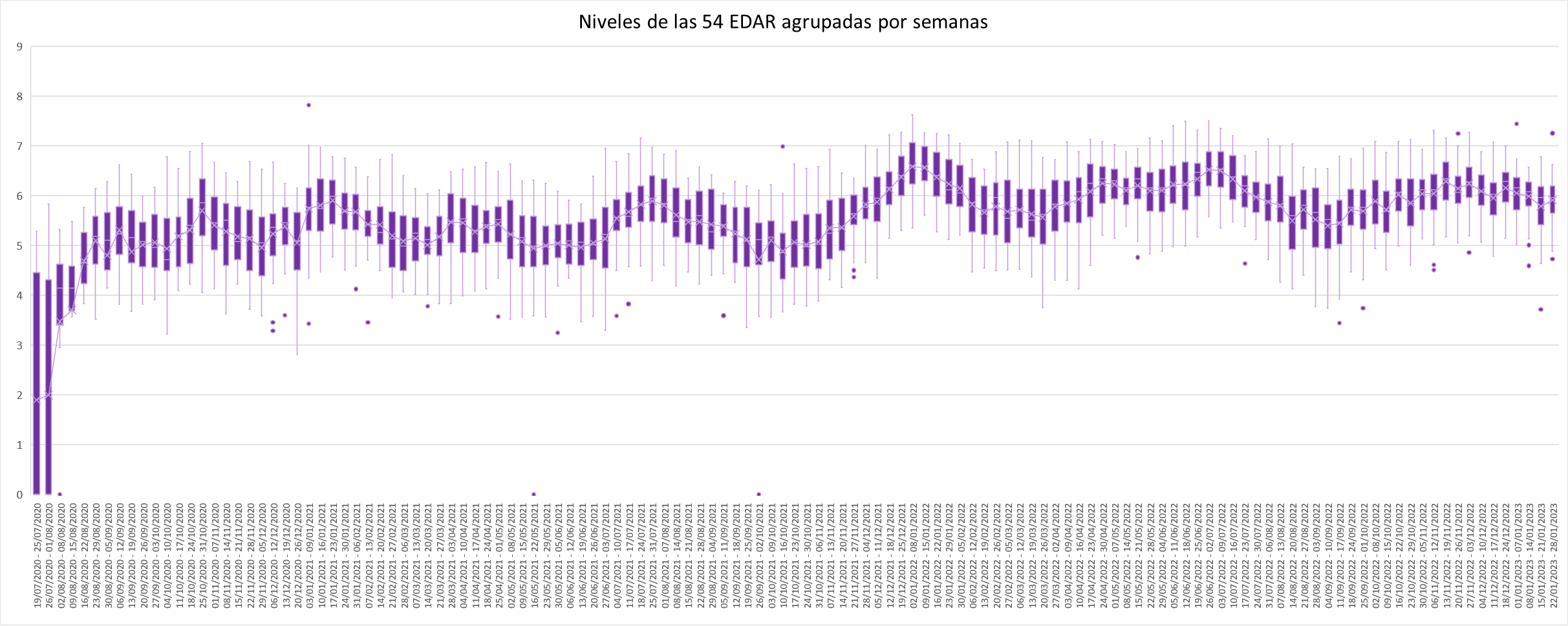 Los resultados de los informes, publicados a lo largo del mes de enero de 2023 en la página web del MITECO, muestran una situación de disminución paulatina, con niveles incluso inferiores a los registrados durante los meses de junio y julio de 2022. Durante este periodo, se alcanzó un valor máximo en la semana del 26 de junio al 7 de julio, con una concentración promedio del virus un 60% mayor a la registrada en la última semana de muestreo publicada, del 22 al 28 de enero de 2023.