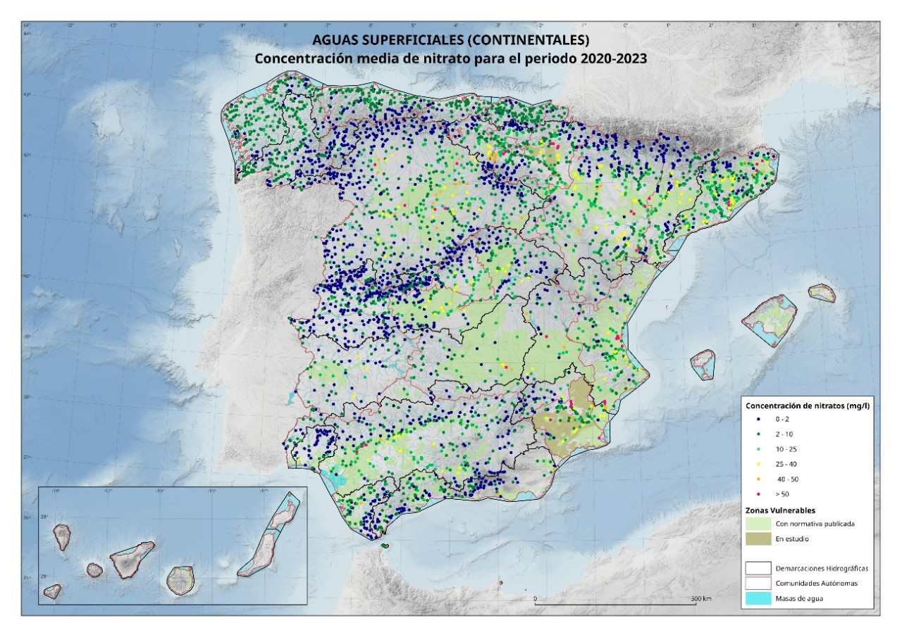 Según establece el artículo 9 del Real Decreto 47/2022, de 18 de enero, sobre protección de las aguas contra la contaminación difusa producida por los nitratos procedentes de fuentes agrarias, que transpone la Directiva de Nitratos, el diagnóstico de la contaminación por nitratos en España se lleva a cabo mediante programas de muestreo y seguimiento de la calidad de las aguas integrados en las redes de control establecidas en los correspondientes planes hidrológicos para el seguimiento del estado de las aguas superficiales, de las aguas subterráneas y de las zonas protegidas, en coordinación con el Real Decreto 817/2015, de 11 de septiembre, como respuesta a lo dispuesto en el artículo 8 de la Directiva Marco del Agua (Directiva 2000/60/CE del Parlamento Europeo y del Consejo, de 23 octubre de 2000).