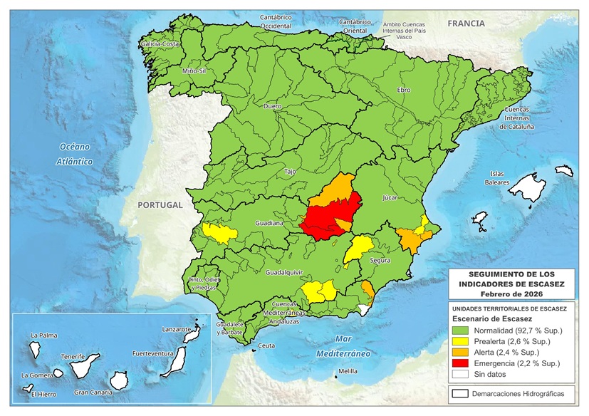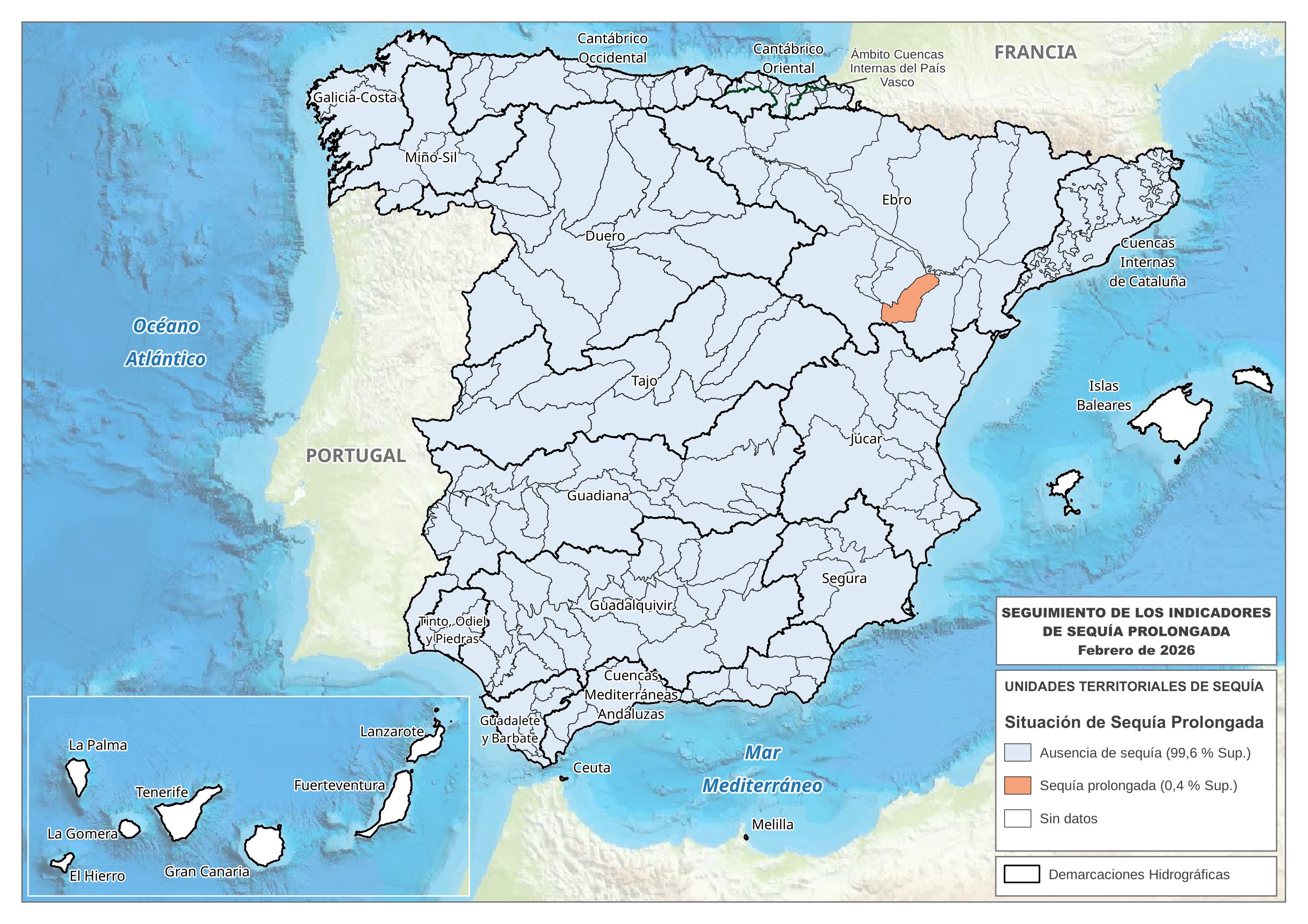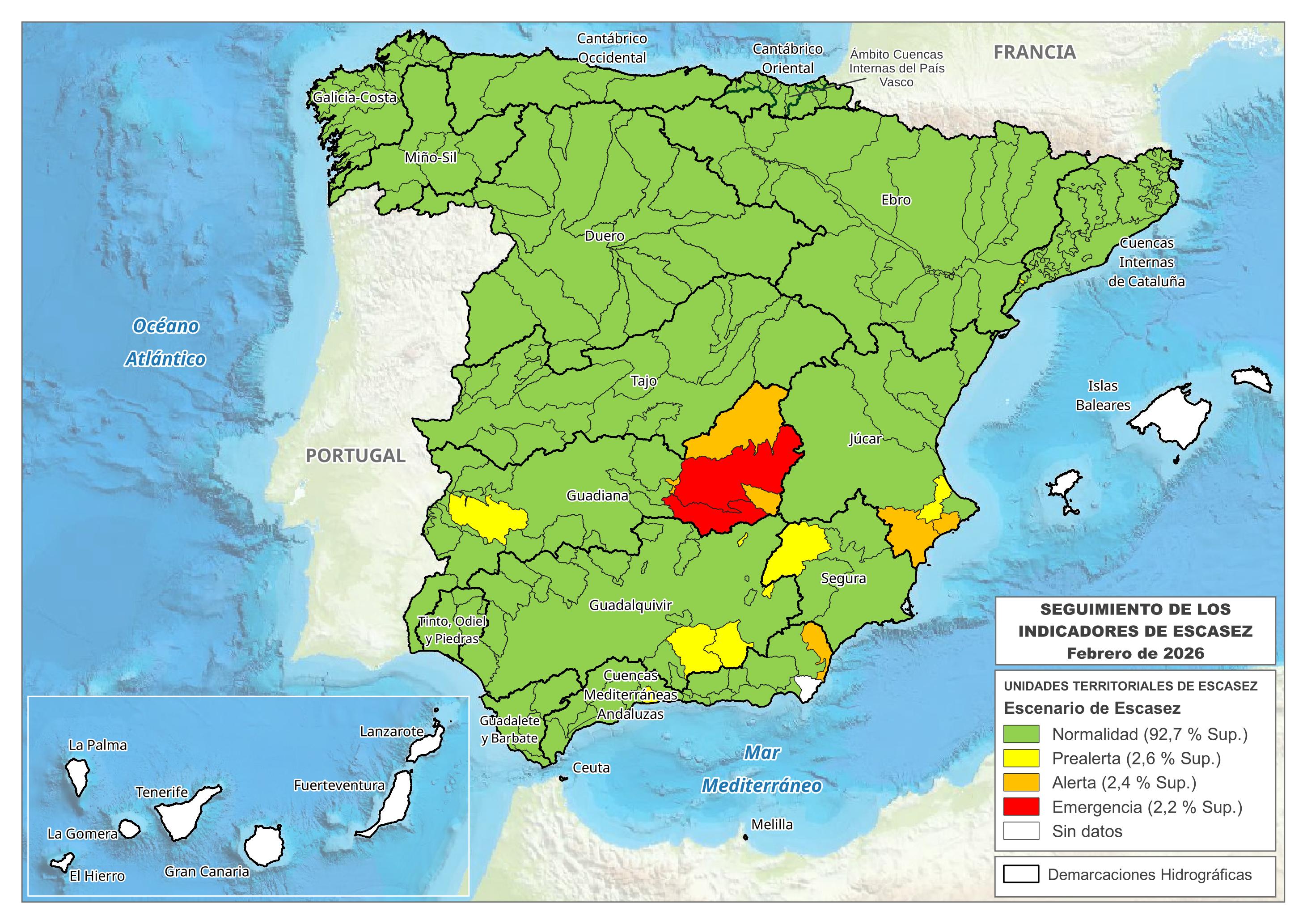 El Ministerio para la Transición Ecológica y el Reto Demográfico realiza un seguimiento mensual de los indicadores y situación de sequía y escasez en todas las Demarcaciones Hidrográficas intercomunitarias. Se publica un informe-resumen sobre la situación de sequía y escasez, así como sendos mapas con los valores de los escenarios correspondientes al último día del mes anterior.