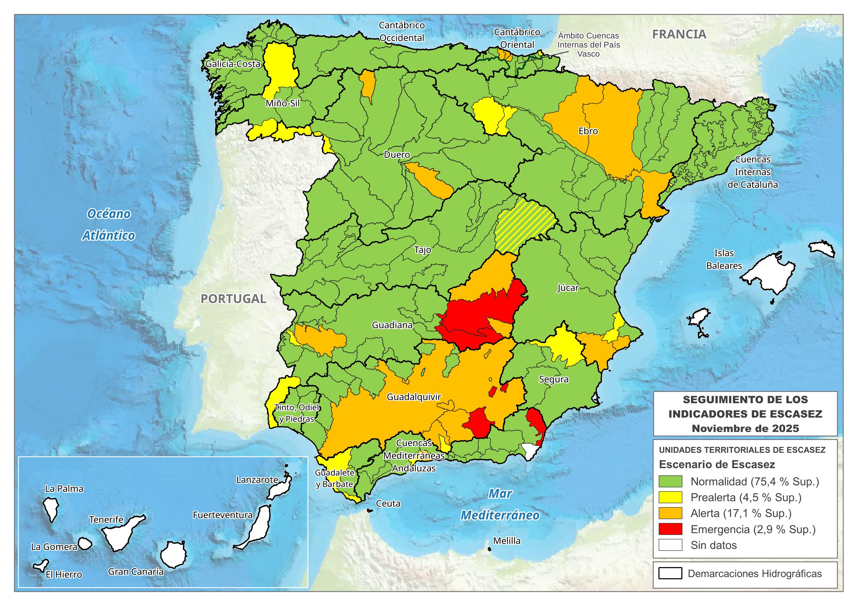 Mapa indicadores escasez a fecha 30/11/2025 (clic en la imagen para ampliar)