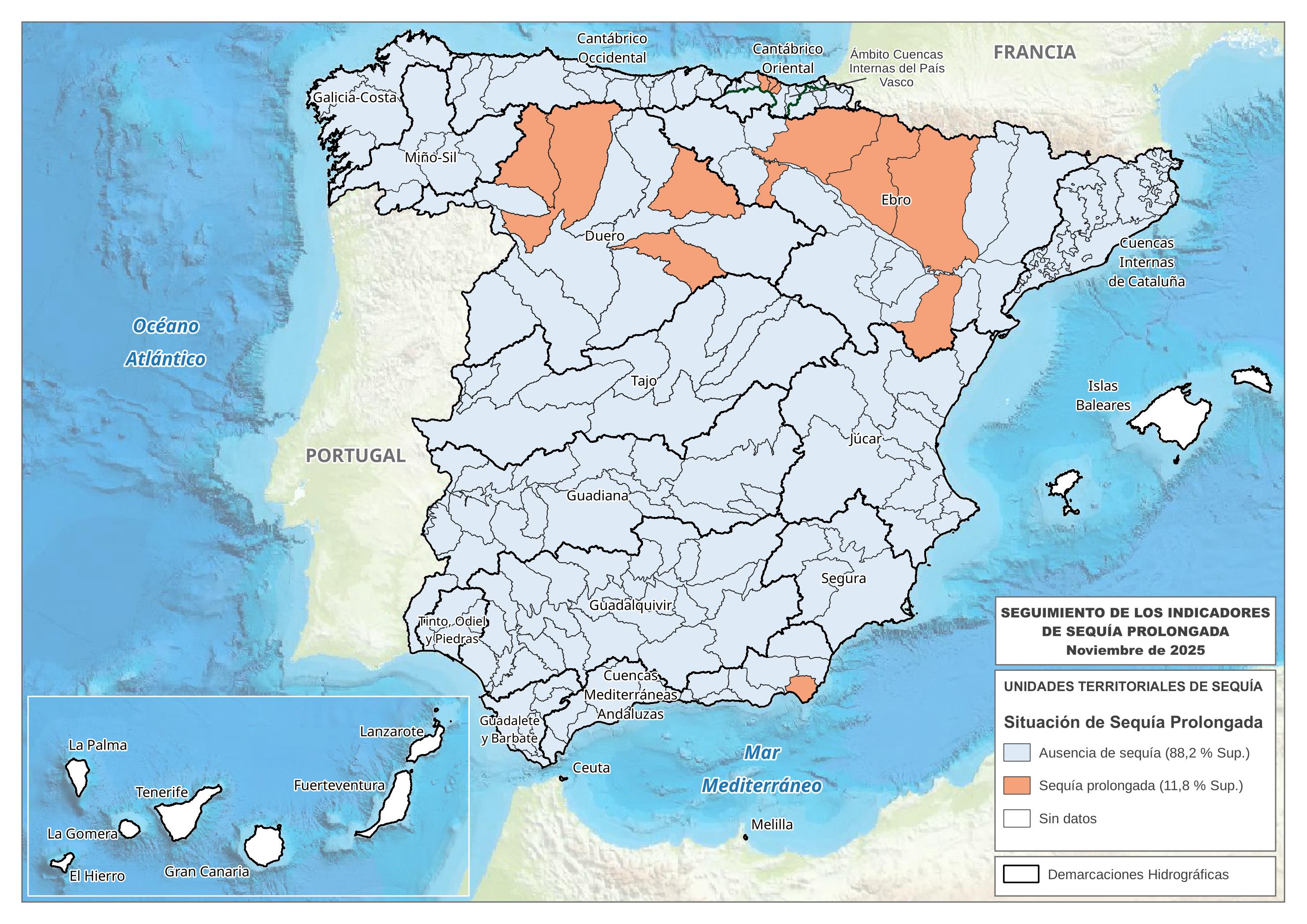Mapa indicadores sequía prolongada a fecha 30/11/2025 (clic en la imagen para ampliar)