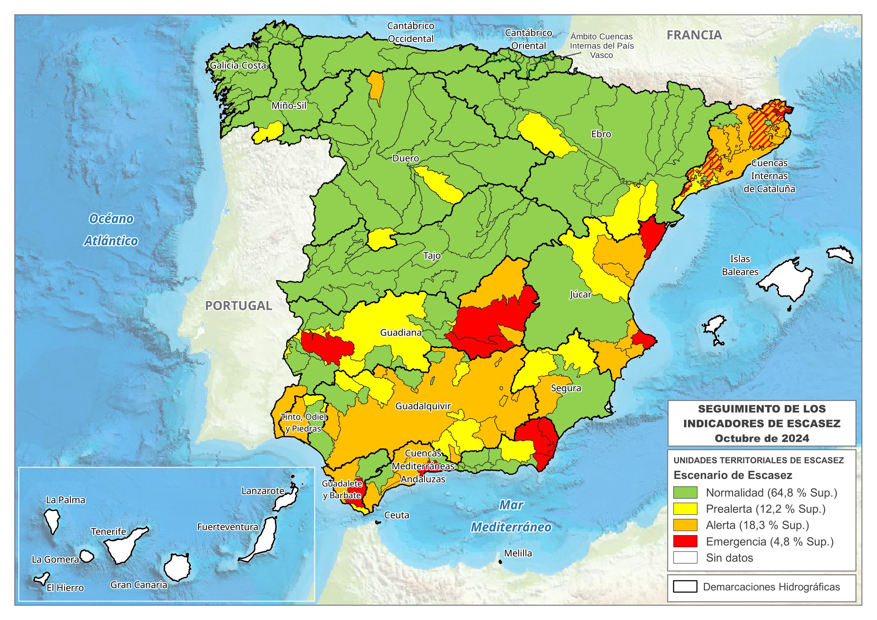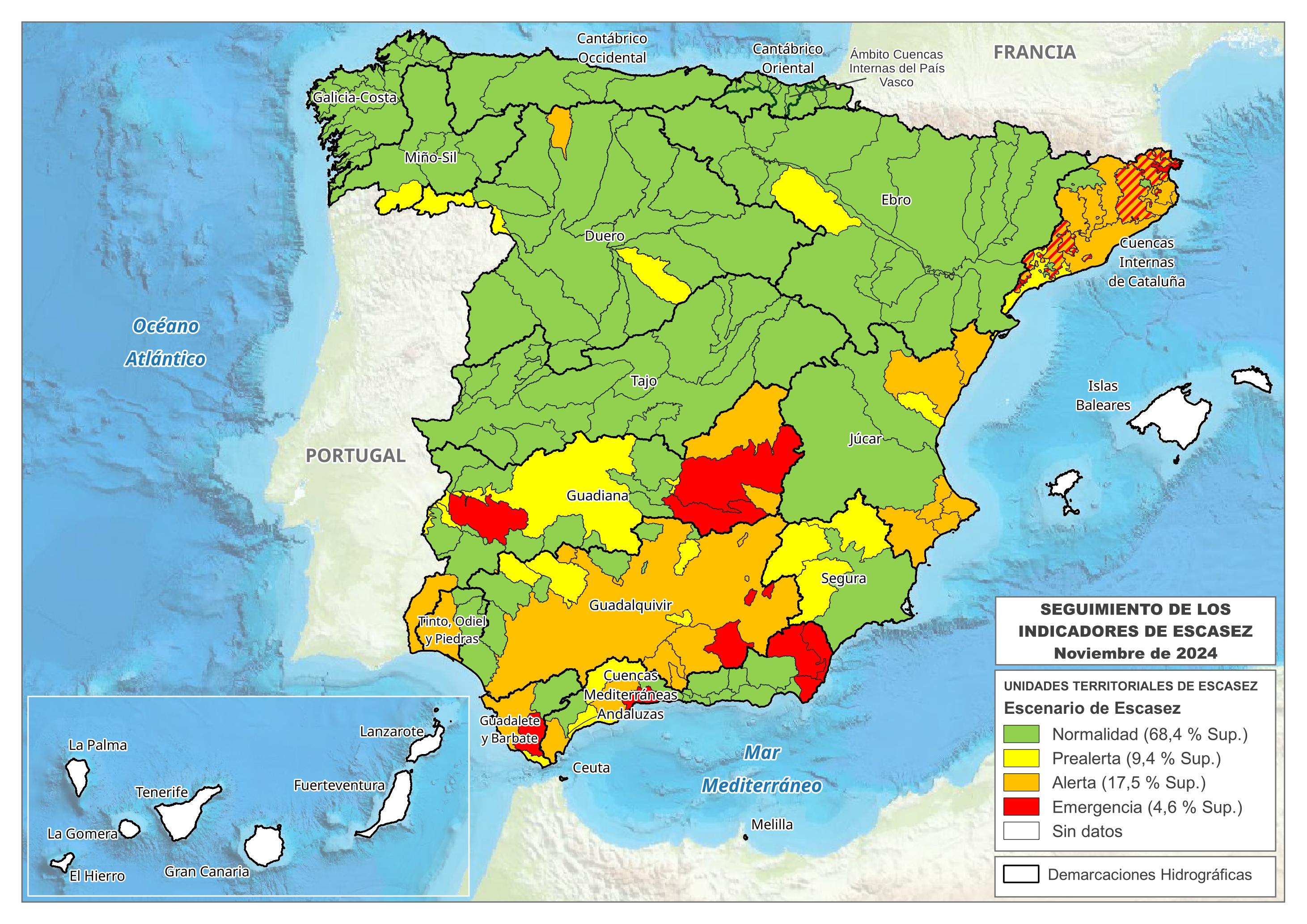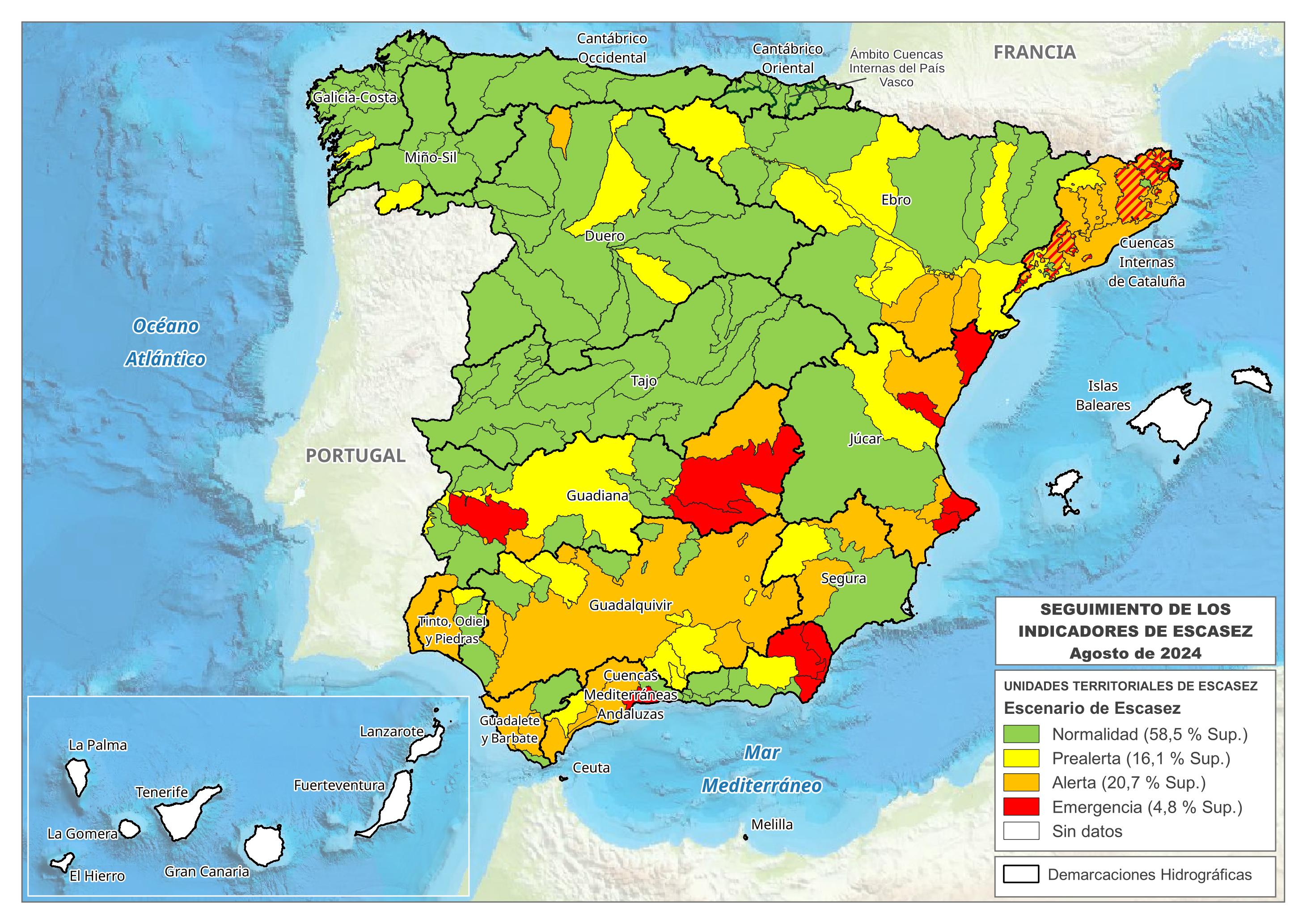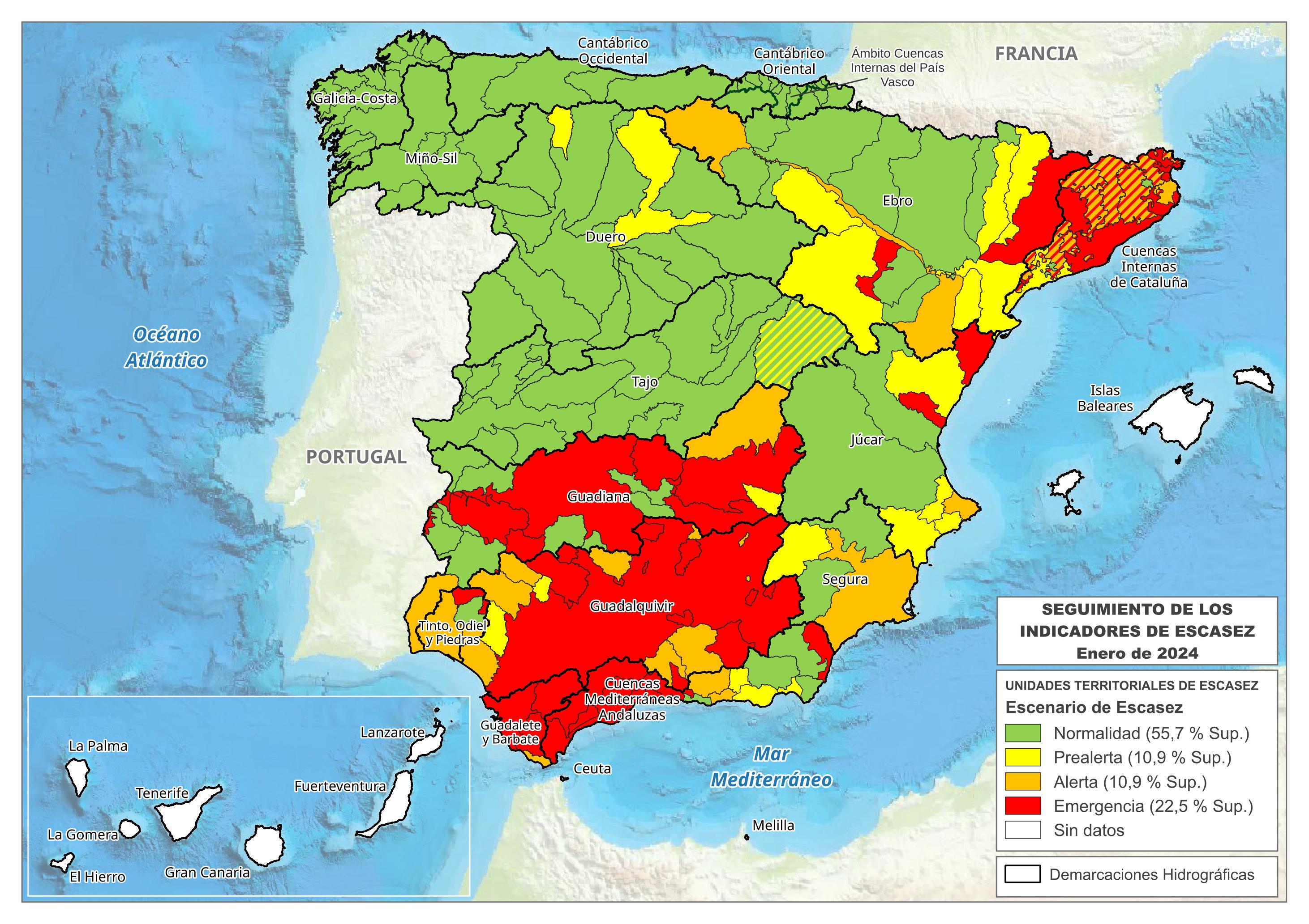 A través de los enlaces de la siguiente Tabla se pueden descargar los informes y mapas mensuales de sequía y escasez del año 2024. Para cada mes, los mapas corresponden al último día del mes anterior, elaborándose los informes a partir de dichos datos.
