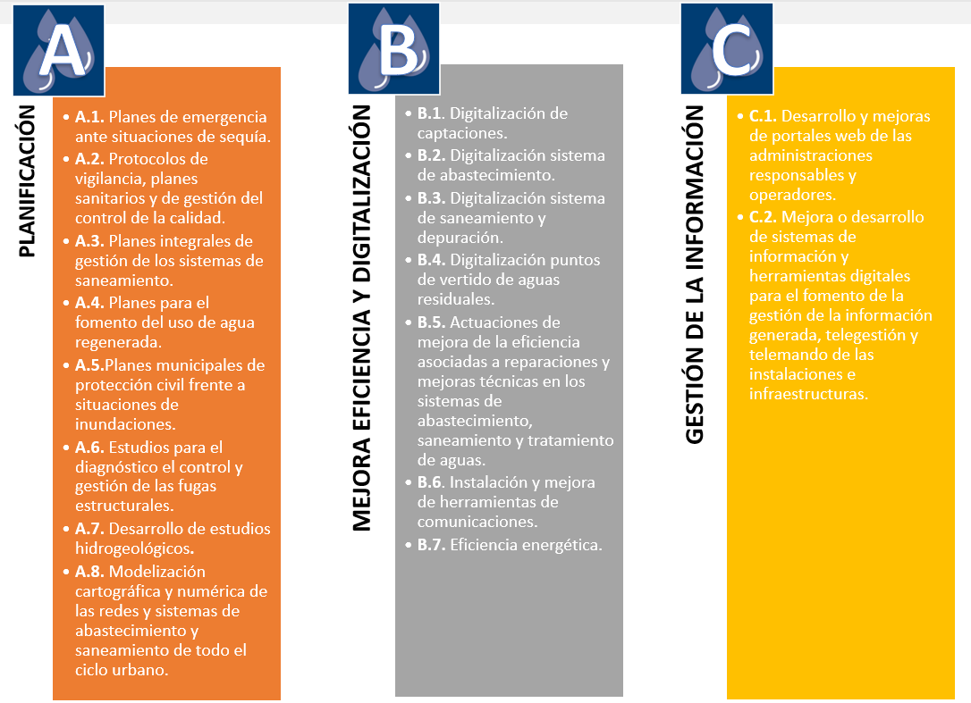 En línea con las anteriores convocatorias, se podrán financiar proyectos de digitalización del ciclo urbano del agua que abarquen abastecimiento en alta, distribución, saneamiento y depuración, con el objetivo claro de mejorar el conocimiento de los usos del agua, reducir las pérdidas, mejorar la eficiencia de los sistemas, optimizar el gasto energético, impulsar la transparencia y la comunicación con la ciudadanía y entes públicos y privados involucrados en las distintas fases del ciclo urbano.