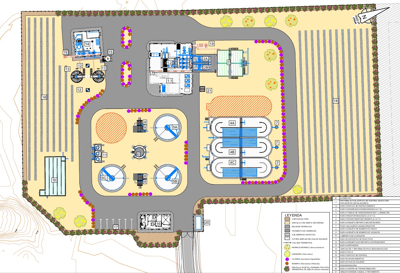 1. Ampliación de la EDAR de Mazagón dentro del recinto actual y la parcela inmediatamente al norte. Los trabajos incluyen la demolición de todos los recintos actuales salvo el laberinto de cloración y la reforma y ampliación de los dos edificios. Para el tratamiento biológico se ha optado tres líneas de aireación prolongada dejando el especio para poder incluir una cuarta si se considera necesario en el futuro.