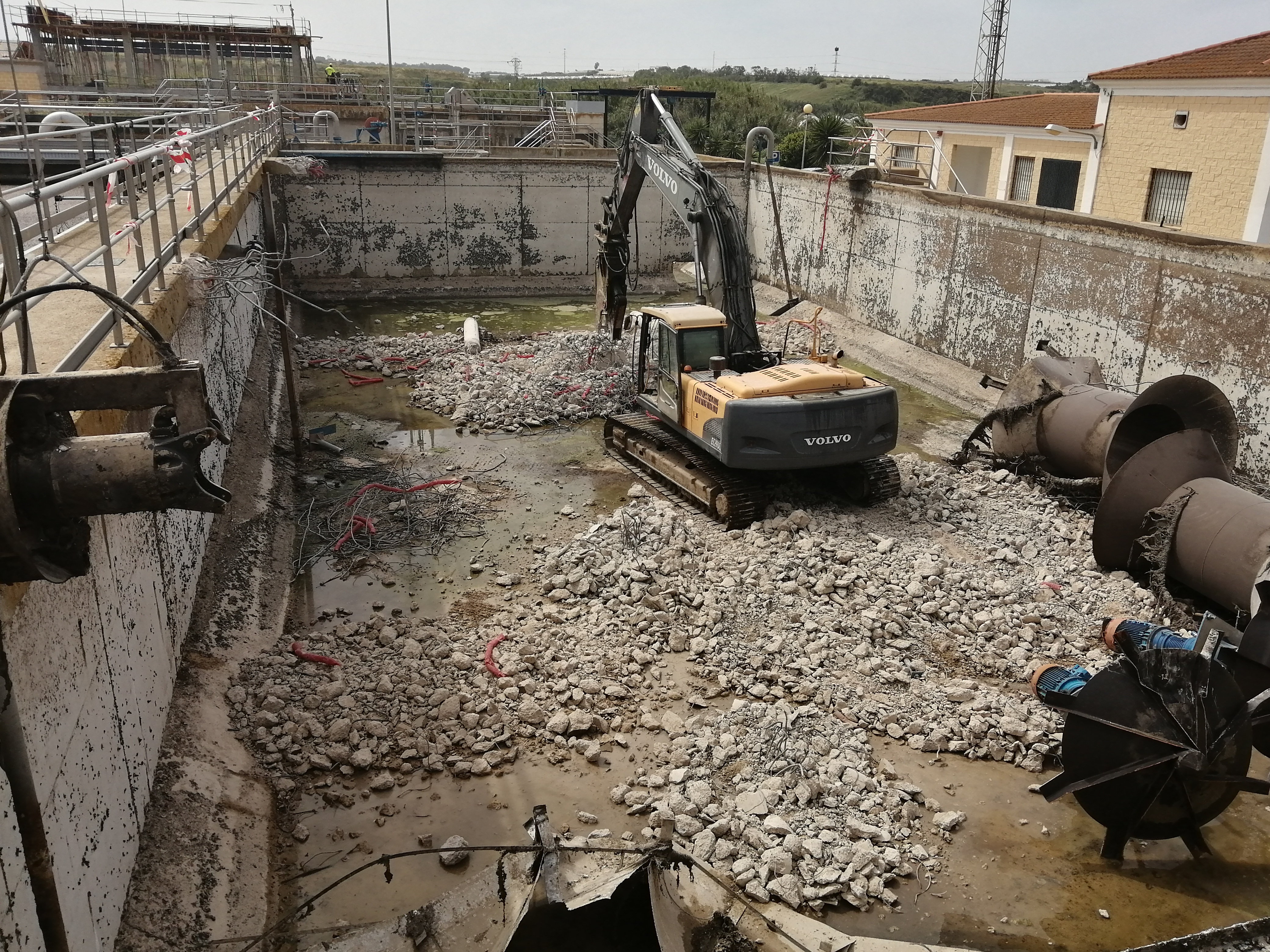 Obras en la EDAR: ejecución de un nuevo pretratamiento cubierto por un nuevo edificio y posterior demolición del existente, remodelación de las balsas de tratamiento biológico para el nuevo proceso de funcionamiento, construcción de un nuevo edificio de aireación, remodelación de la salida de agua tratada y adecuación de la línea de fangos a las nuevas necesidades.