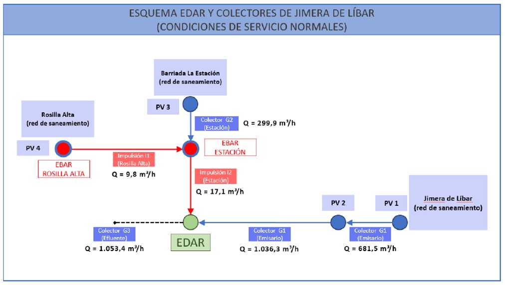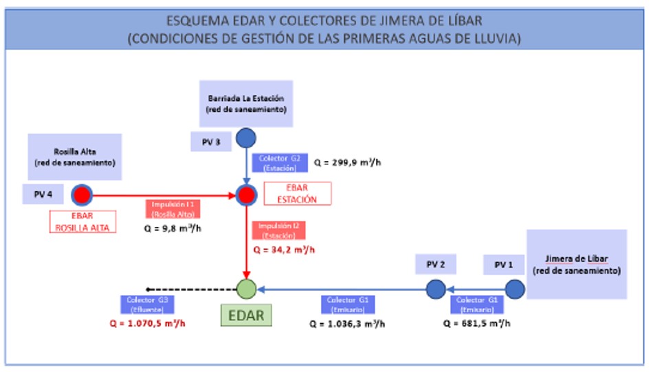 - Los colectores, tuberías de impulsión y obras complementarias necesarias para la agrupación de todos los vertidos de aguas residuales del municipio de Jimera de Líbar, Barriada La Estación y Rosilla Alta, y su conducción hasta la ubicación de la EDAR.