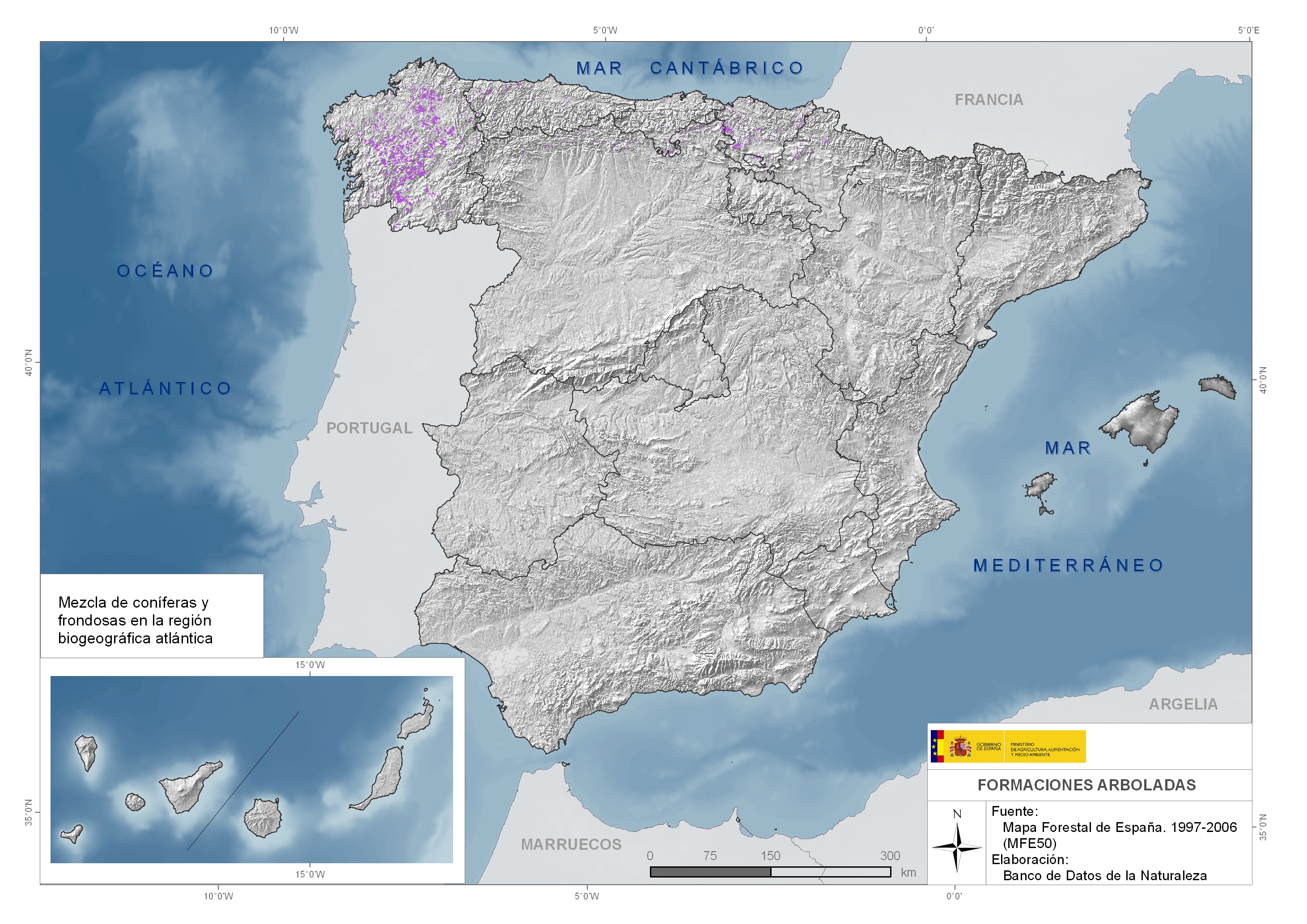 Mezcla de coníferas y frondosas autóctonas en la región biogeográfica Macaronésica