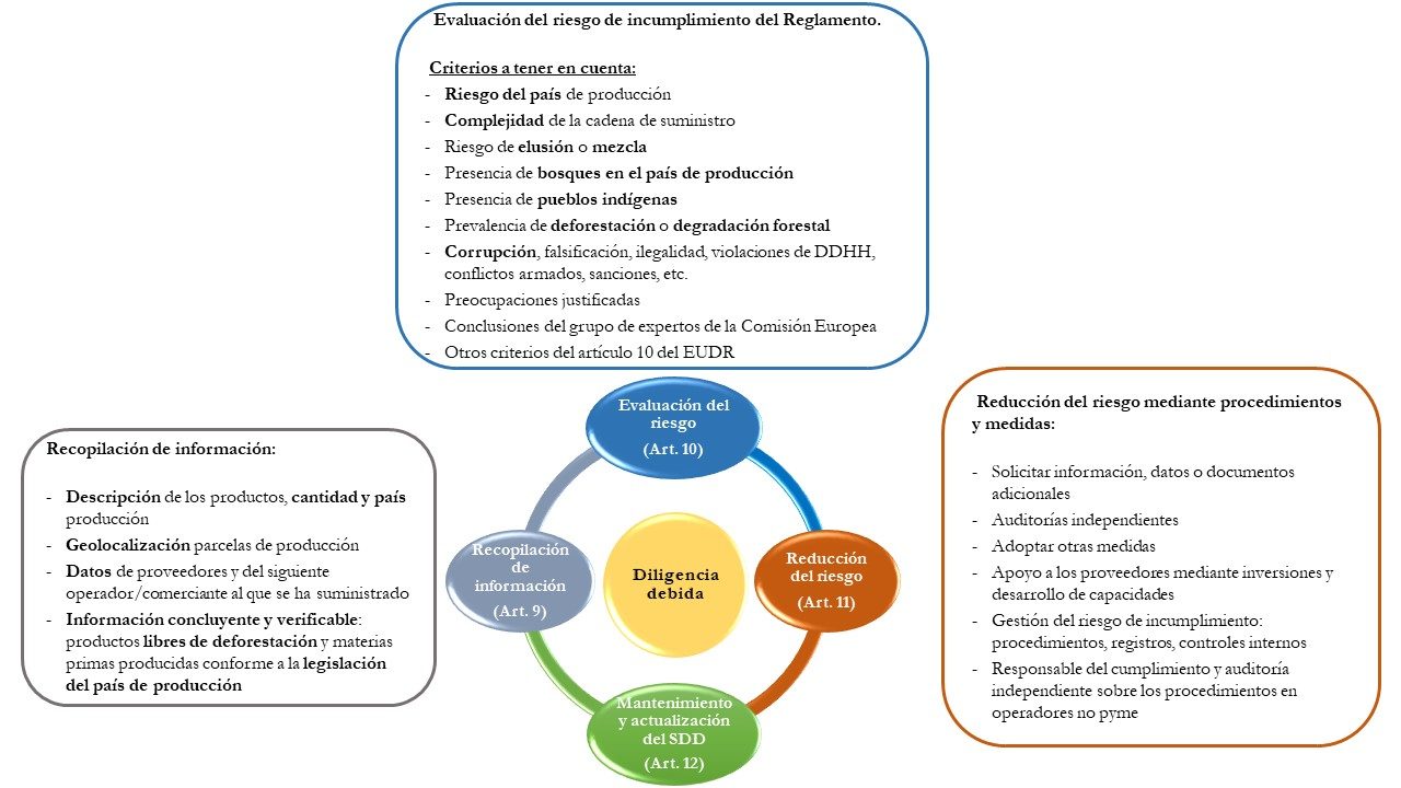 El ejercicio de la diligencia debida debe incluir todos los requisitos establecidos en los artículos 9 a 11 del Reglamento EUDR , que resumidamente, son los siguientes: