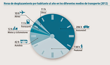 De acuerdo con el trabajo ya citado, ”Las cuentas ecológicas del transporte en España”, en 2012 los españoles invertimos 430 horas en desplazarnos, de las cuales algo más de la mitad transcurrieron a bordo de automóviles, motos o ciclomotores.