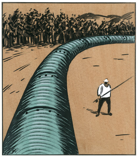 Dos hombres a la orilla de un río con el pueblo de fondo, uno dice: "estamos llevando el río al desierto y trayendo el desierto al río" el otro responde "menudo obrón"