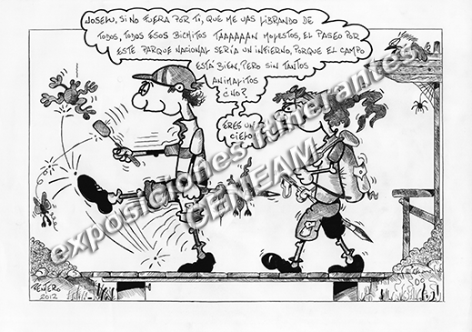 Exposición de viñetas Vaya Fauna. Dos excursionistas caminado por el campo
