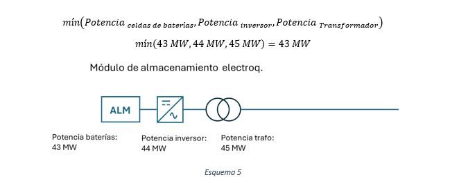 En el Esquema 5, la potencia instalada del módulo de almacenamiento electroquímico vendrá determinada por la mínima potencia de los elementos conectados en serie, siendo esta la de las celdas de baterías antes del inversor: