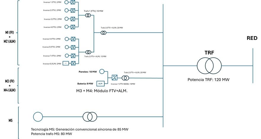 Dada una instalación como la representada en el Ejemplo 4, compuesta por un módulo compuesto a su vez por un módulo fotovoltaico y un módulo de almacenamiento electroquímico (M1 + M2), un módulo compuesto a su vez por un módulo fotovoltaico y un módulo de almacenamiento electroquímico que conectan al mismo inversor (M3 + M4) y un módulo de generación síncrona (M5), se calcula a continuación la potencia instalada de la instalación.