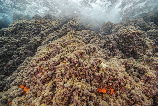 -1m. Varias colonias del coral naranja Astroides calycularis han logrado asentarse entre la maraña de algas rojas.