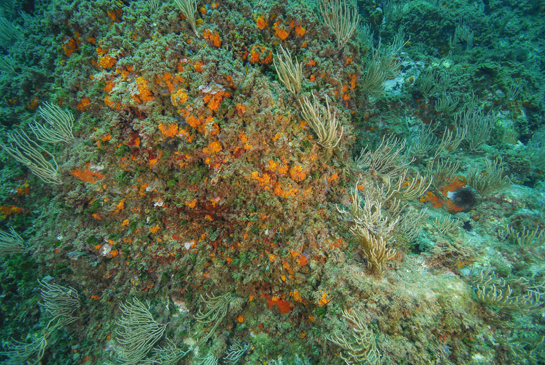 -7m. Este tipo de comunidad de algas rojas y coral naranja situada a poca profundidad, se denomina Comunidad de Algas Esciáfilas de Modo Calmo o Precoralígeno