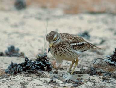 Es un ave grande de 40 cm con una cabeza redondeada y grandes ojos amarillos. Se mueve por terrenos pedregosos y arenosos descubiertos o eriales y colinas desnudas generalmente con poca vegetación. Ocasionalmente frecuenta marismas o entornos con pinos dispersos. Es característico el grito que emite principalmente al anochecer.