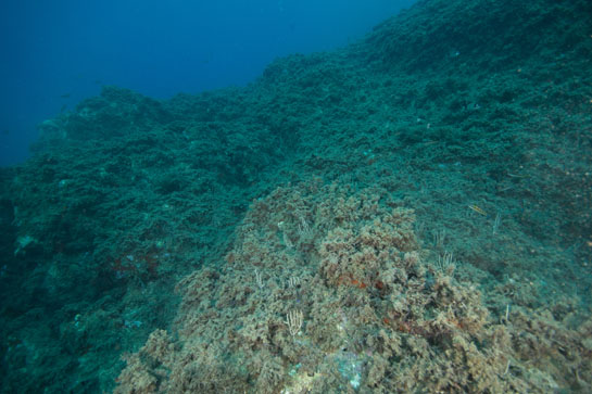 –17m. El pequeño extraplomo sirve de asentamiento a diferentes especies de esponjas rojas, coral naranja y el alga verde de ambientes umbríos Flabellia petiolata.