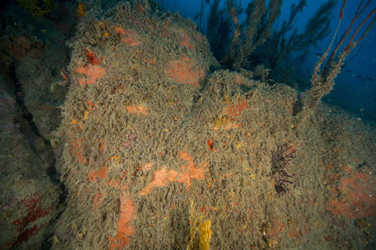 –9m. Las esponjas rojas (Cambre cambre) recubren los pocos espacios dejados por las algas pardas.