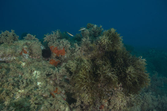 – 7m. Varias julias (Coris julis) nadan sobre bloques de piedra cubiertos por las algas Dictyoteris polypoides y Halopteris scoparia. En la pared vertical se pueden ver varios ejemplares de esponjas rojas, posiblemente Crambe crambe, y dos erizos, el de la derecha Paracentrotus lividus mientras que el de la izquierda puede tratarse de la variedad negra de esta misma especie o del erizo negro Arbacia lixula.