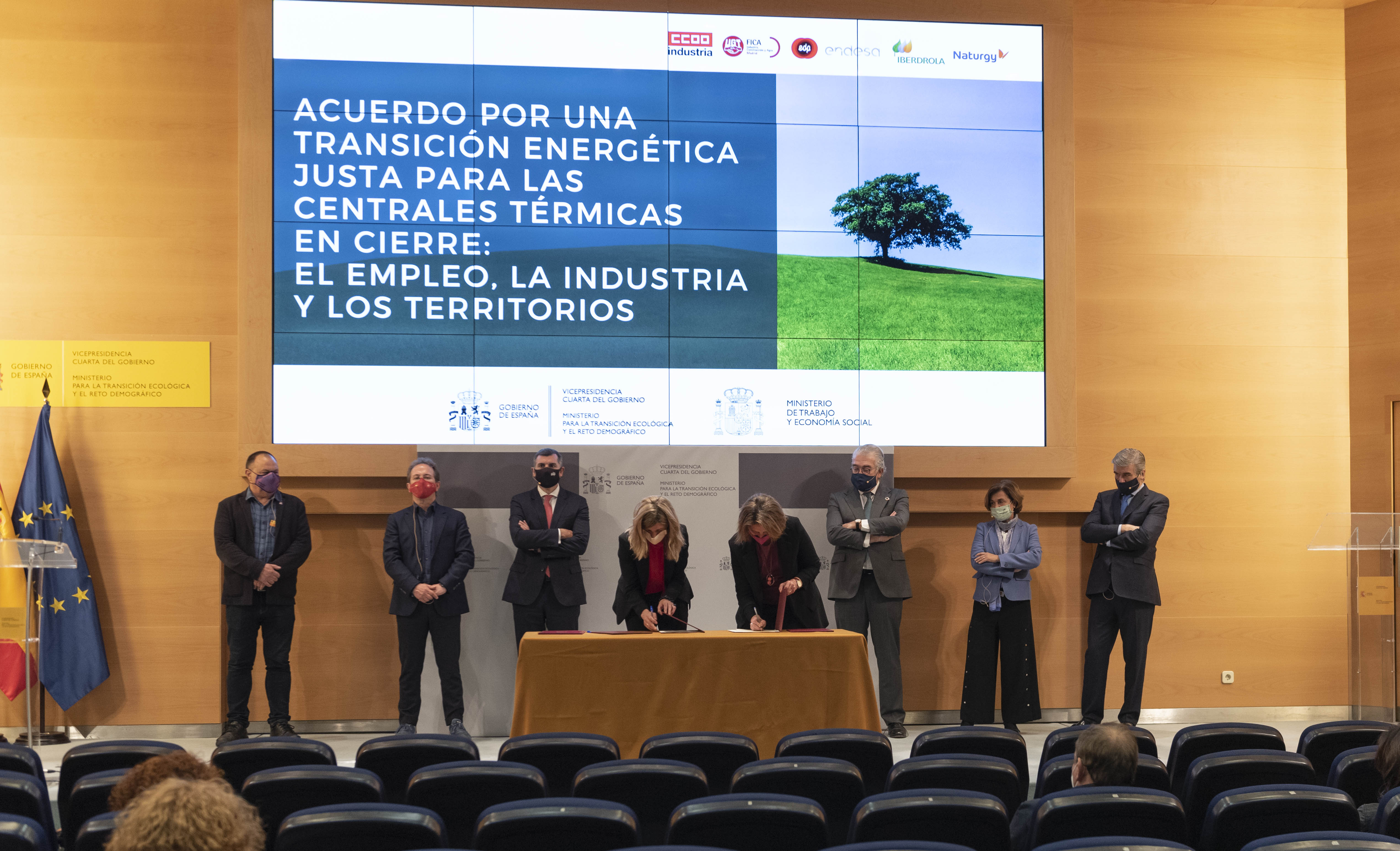 La vicepresidenta cuarta del Gobierno y ministra para la Transición Ecológica y el Reto Demográfico, Teresa Ribera; la ministra de Trabajo y Economía Social, Yolanda Díaz; el secretario general de CCOO Industria, Agustín Martín; el secretario General de UGT FICA, Pedro L. Hojas; el consejero delegado de EDP España, Rui Teixeira; el consejero delegado de Endesa, José Bogas; la consejera delegada de Iberdrola España, Ángeles Santamaría y el presidente ejecutivo de Naturgy, Francisco Reynés, han participado hoy en el acto de adhesión del grupo energético EDP al “Acuerdo por una Transición Energética Justa para las centrales térmicas en cierre: el empleo, la industria y los territorios”, alcanzado el 17 de abril de 2020. Con la suma de esta compañía el acuerdo incorpora ya a todas las centrales térmicas de carbón de España, lo que le convierte en un pacto único en el mundo por el grado de consenso alcanzado.