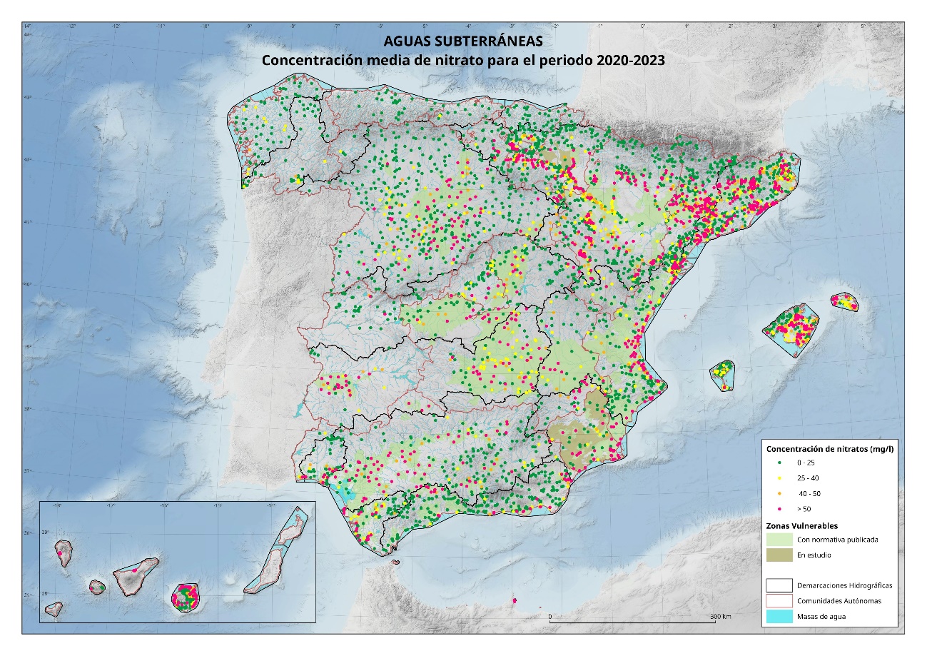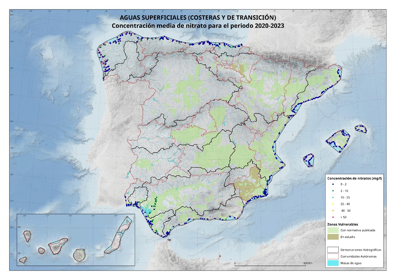 Según establece el artículo 9 del Real Decreto 47/2022, de 18 de enero, sobre protección de las aguas contra la contaminación difusa producida por los nitratos procedentes de fuentes agrarias, que transpone la Directiva de Nitratos, el diagnóstico de la contaminación por nitratos en España se lleva a cabo mediante programas de muestreo y seguimiento de la calidad de las aguas integrados en las redes de control establecidas en los correspondientes planes hidrológicos para el seguimiento del estado de las aguas superficiales, de las aguas subterráneas y de las zonas protegidas, en coordinación con el Real Decreto 817/2015, de 11 de septiembre, como respuesta a lo dispuesto en el artículo 8 de la Directiva Marco del Agua (Directiva 2000/60/CE del Parlamento Europeo y del Consejo, de 23 octubre de 2000).