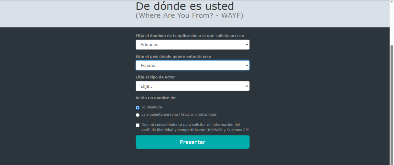 En el caso de los importadores registrados en España, el acceso al Registro Transitorio debe hacerse a través del Dominio “Aduanas” y a continuación seleccionar España como el país donde quiere autenticarse: