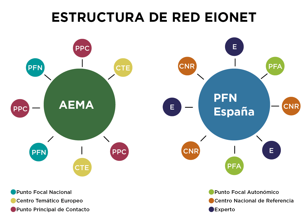 La AEMA es responsable de desarrollar Eionet y coordinar sus actividades con el apoyo de los Puntos Focales Nacionales (NFP) en los países. Los NFP son las instituciones nacionales designadas para servir como vínculo principal entre la AEMA y el país, facilitando y coordinando redes de expertos nacionales involucrados en actividades relacionadas con el programa de trabajo de la AEMA. La Subdirección General de Relaciones Internacionales ejerce este papel como Punto Focal Nacional para la AEMA (Real Decreto 503/2024, de 21 de mayo, por el que se desarrolla la estructura orgánica básica del Ministerio para la Transición Ecológica y el Reto Demográfico).